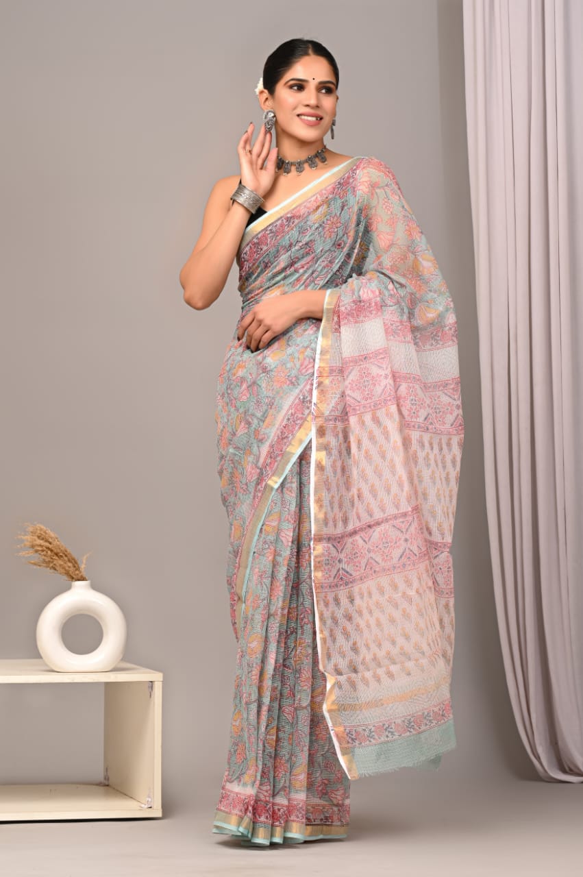 New Unique collection of Colourful Hand block printed kota doriya sarees with blouse.